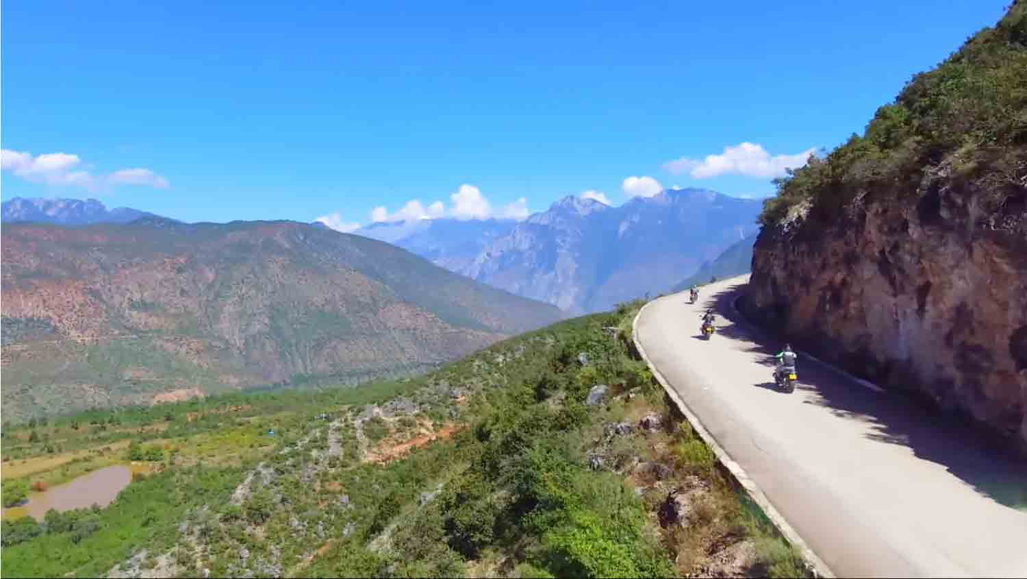 Kurz darauf erreichen wir die Ausläufer des Haba Snow Mountain (5.396 m), dessen schneebedeckter Gipfel steil über dem Tal aufragt. Von hier aus führt eine lange Abfahrt in die dramatische Tiger Leaping Gorge, eine der tiefsten Flussschluchten der Erde. Während wir auf etwa 1.900 Meter hinabfahren, weicht die kühle Bergluft einem warmen subtropischen Klima – plötzlich säumen Bananenbäume, Kakteen und üppige Vegetation die Straße. Über uns erhebt sich das Massiv des Jade Dragon Snow Mountain, dessen Felswände bis zu 3.000 Meter fast senkrecht über dem Fluss aufragen und ein unvergessliches, nahezu unwirkliches Panorama schaffen. Die schmale, direkt am Fels verlaufende Straße ist nicht durch Leitplanken gesichert und bietet ständig spektakuläre Ausblicke in die tobende Schlucht tief unter uns.