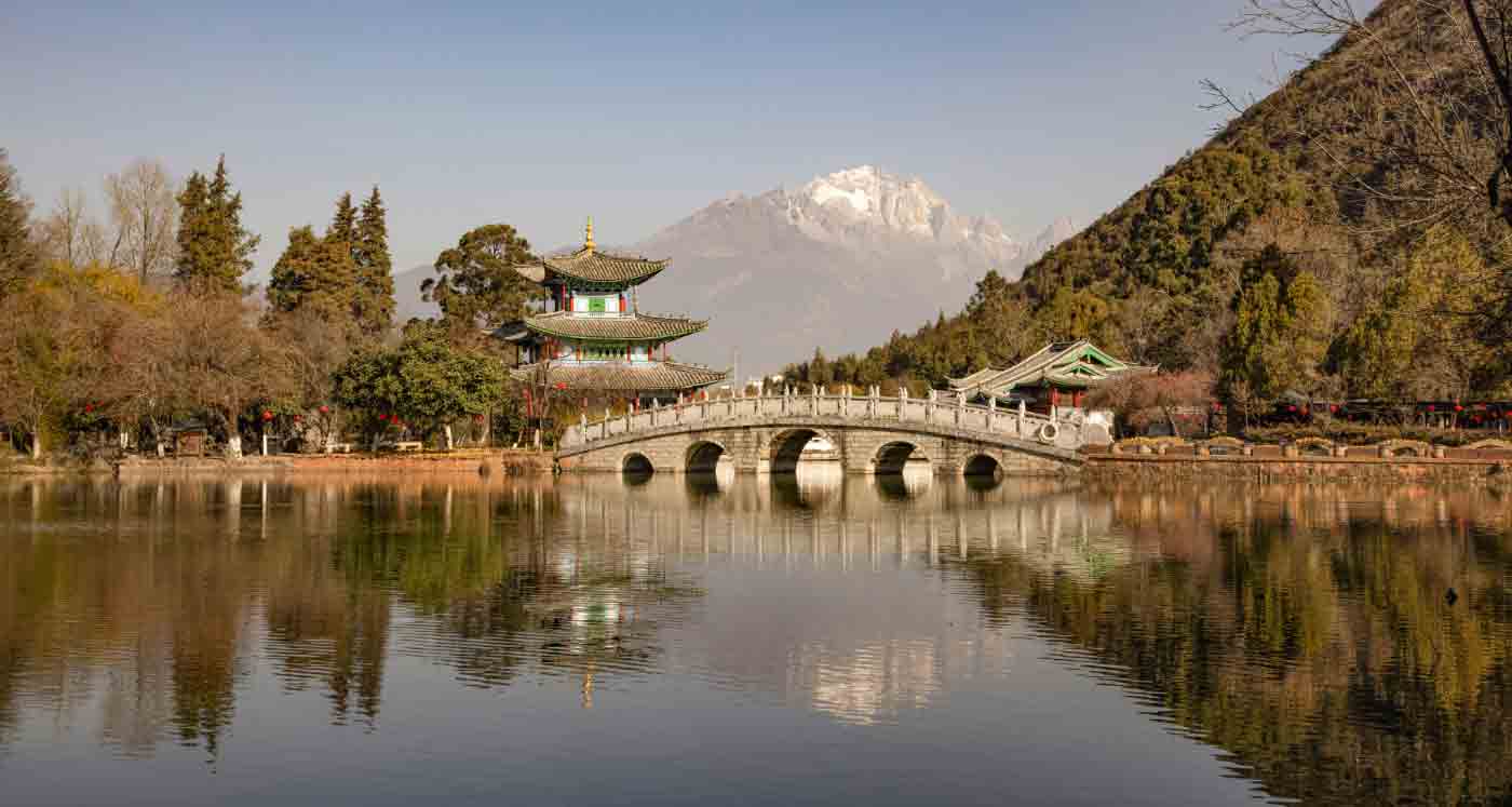 • Die UNESCO-Welterbestadt Lijiang, eingerahmt vom 5.500 Meter hohen Jade Dragon Snow Mountain (Yulong Shan), einem der bekanntesten Wahrzeichen Yunnans.