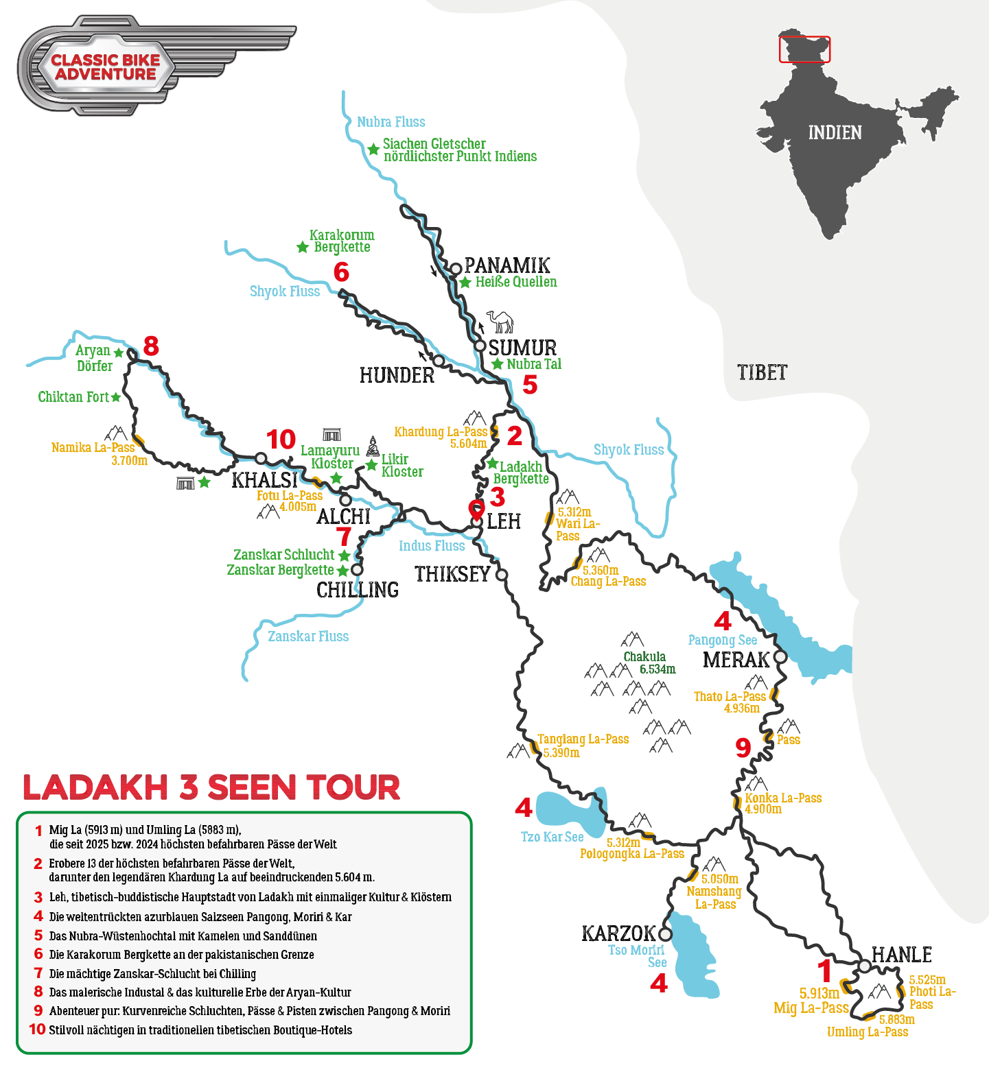 Mit mehr als drei Jahrzehnten Expeditionserfahrung in Ladakh wurde diese Tour sorgfältig entwickelt, um die spektakulärste Kombination aus Routen, Pässen und kulturellen Höhepunkten zu bieten. Der Reiseverlauf umfasst zwölf Fahrtage und dreizehn hohe Himalaya-Pässe und gehört damit zu den umfassendsten Motorradreisen in Ladakh. Damit die Reise möglichst komfortabel beginnt, startet die Tour mit einem Direktflug von Delhi nach Leh, sodass Ihr Euer Abenteuer direkt im Herzen von Ladakh beginnen könnt – ohne lange Überlandfahrten.