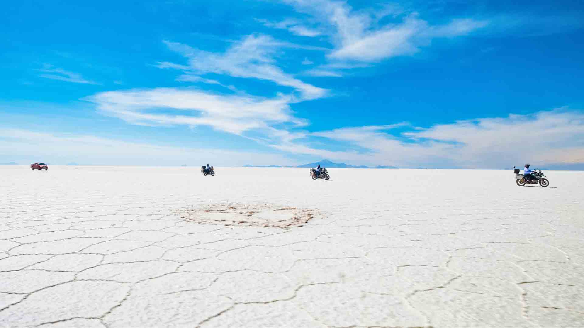 Mit der Einreise nach Bolivien verändert sich die Landschaft dramatisch. Die Straßen werden rauer, die Höhenlagen extremer. In La Paz, dem höchsten Regierungssitz der Welt, erleben wir eine faszinierende Metropole, die sich über eine zerklüftete Andenschlucht erstreckt – chaotisch, lebendig, eindrucksvoll. Von hier aus starten wir ein Abenteuer der besonderen Art: die Fahrt über die legendäre Death Road. Diese schmale, teils unbefestigte Straße windet sich mit über 3.000 Höhenmetern durch Nebelwälder, vorbei an tosenden Wasserfällen und tiefen Abgründen – ein Adrenalinkick mit Panoramablick. Doch das wahre Highlight Boliviens liegt noch vor uns: die Durchquerung des Salar de Uyuni, der größten Salzwüste der Welt. Über 10.000 Quadratkilometer erstreckt sich eine blendend weiße, scheinbar endlose Ebene – eine surreale Kulisse, die uns das Gefühl gibt, auf einer anderen Welt zu fahren. Die Motorräder gleiten über die harte Salzkruste, der Horizont verschwimmt zwischen Himmel und Erde, und auf der Insel Incahuasi ragen meterhohe Kakteen in den Himmel.