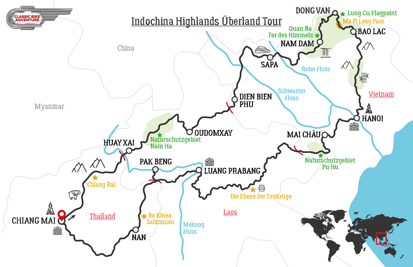 Erlebt das Allerbeste von Nordthailand, Laos und Vietnam auf einer Motorradreise, die Euch tief ins Herz der Hochländer Indochinas führt. Dieses 18-tägige Abenteuer vereint spektakuläre Berglandschaften, faszinierende kulturelle Begegnungen und einige der spannendsten Motorradstrecken in ganz Südostasien. Von den dramatischen Hochländern Nordvietnams über die zeitlosen, rustikalen Landschaften Nordlaos bis hin zum Lanna-Kulturerbe Nordthailands ist diese Tour eine unvergessliche Mischung aus Entdeckung, Freiheit und purer Fahrfreude.
