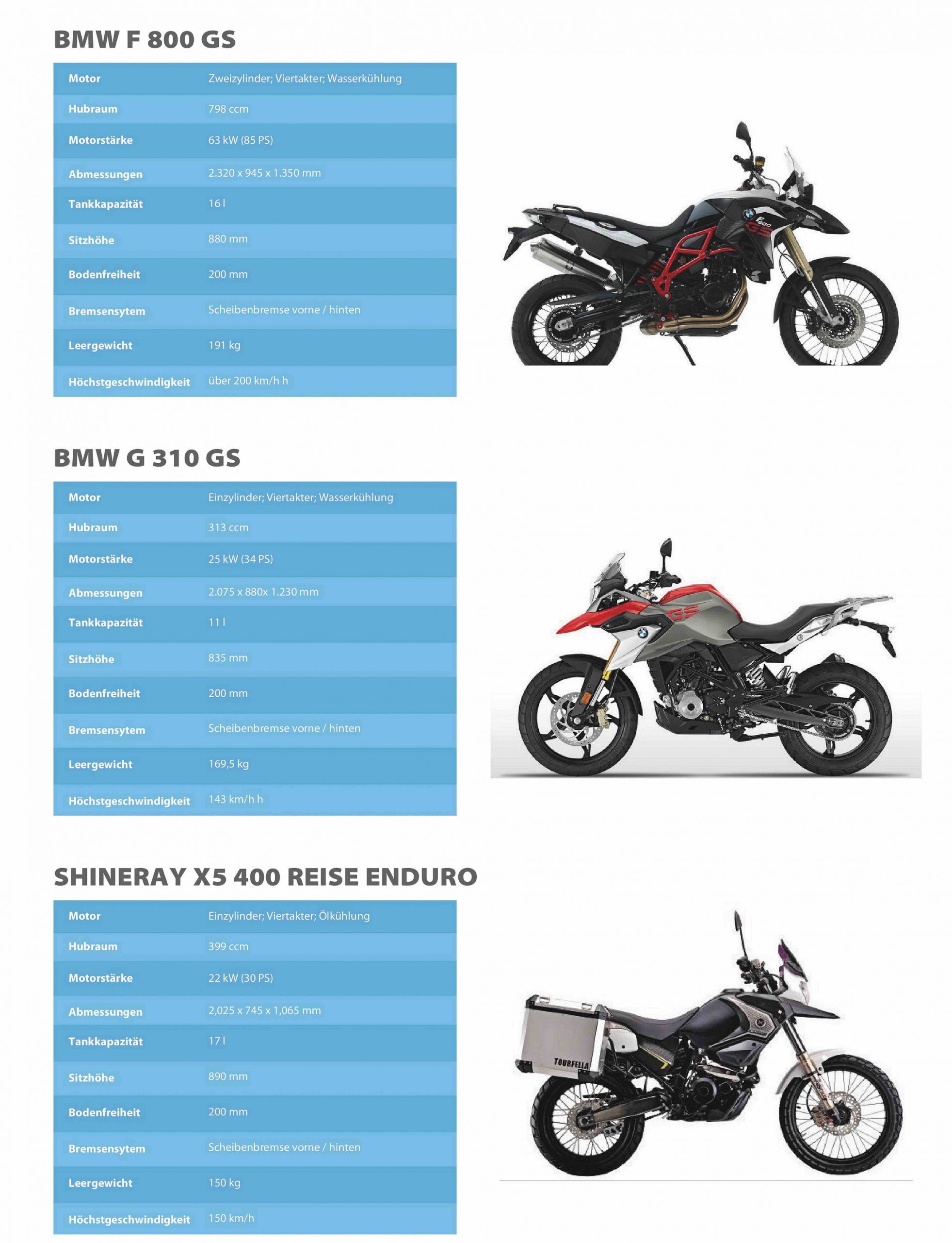 Die BMW G 310 GS ist ebenfalls eine Enduro und hat eine Sitzhöhe von 81cm. Alle Motorräder sind mit je zwei Alukoffern ausgestattet, in die alle für die Tagestouren notwendigen Utensilien hineinpassen. Regenkombi, Ersatzhandschuhe, Fotokamera, Wasserflaschen usw. Das Volumen per Box beträgt zirka 40 Liter.